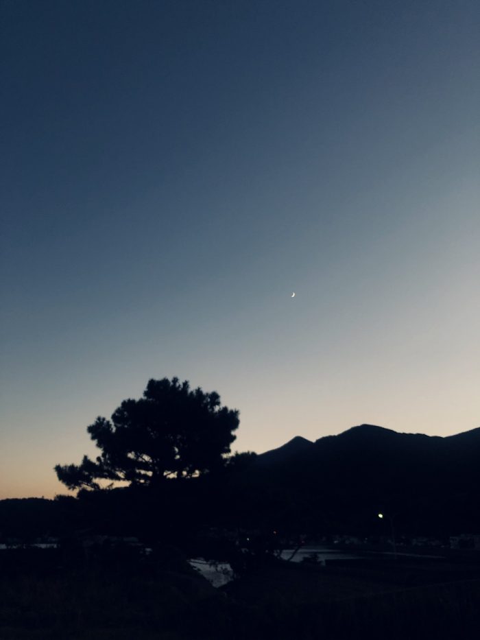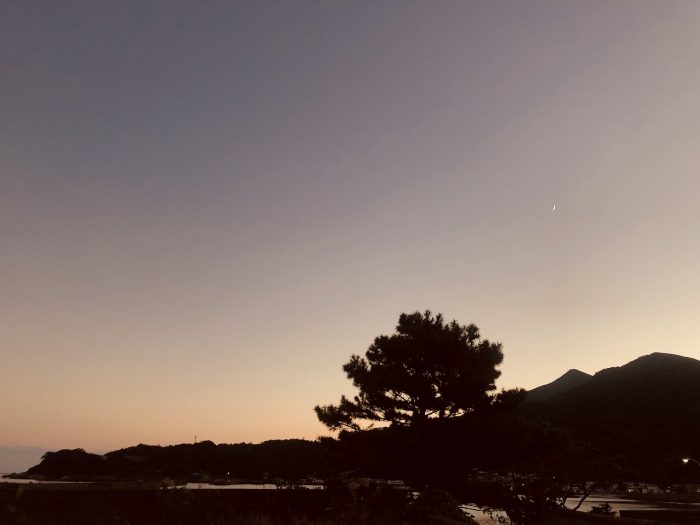 細い月が港に輝く。明日もいい天気になりそう。