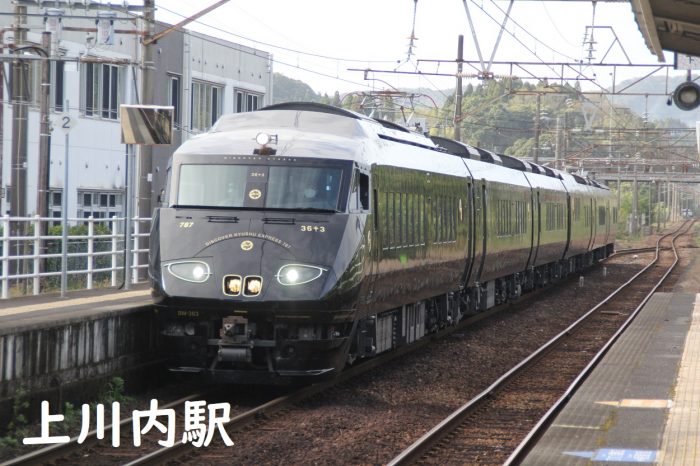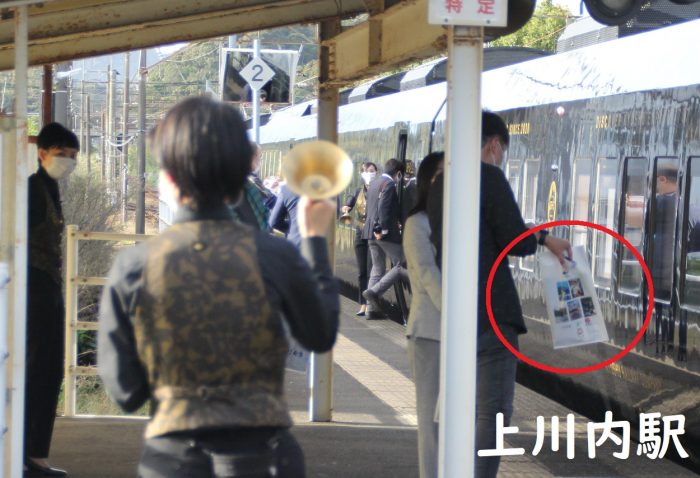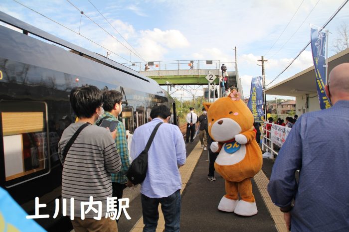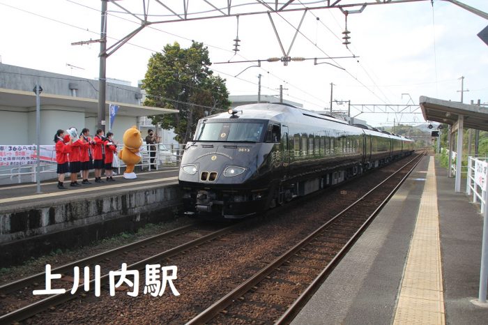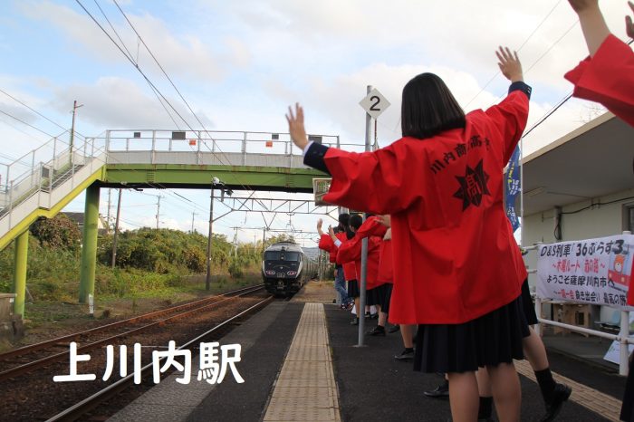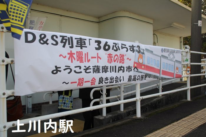 「赤の路」1番列車は熊本駅で出発式が開催されたほかに、運転停車の時間がある上川内駅にて鹿児島県立川内商工高等学校の学生と薩摩川内観光物産キャラクターの“西郷つん”によるお出迎え・おもてなし・お見送りがありました。
