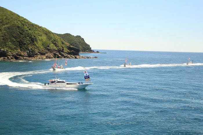 甑大橋開通式の時に漁船パレードの旗艦を観光船かのこが務めたときの写真です。