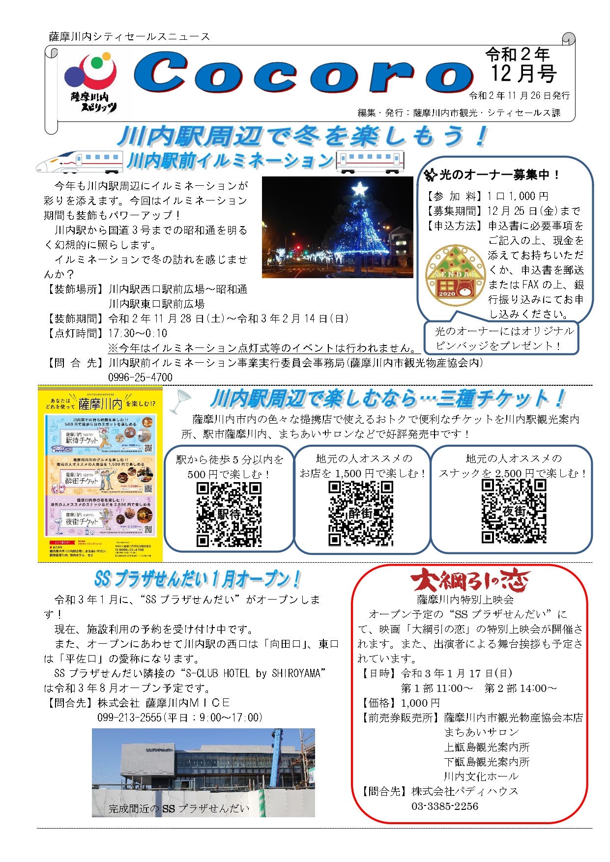「月刊 薩摩川内シティセールスニュース Cocoro 令和2年12月号」が発行されました。