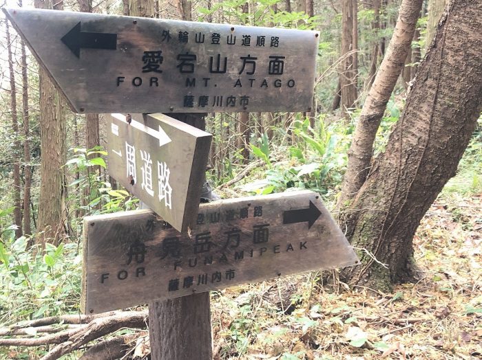 20~30分ほどで、愛宕山山頂に到着。2020と記された新しい標識が設置してあります。頂上ですが、見晴らしはありません。続けて、舟見岳を目指します!