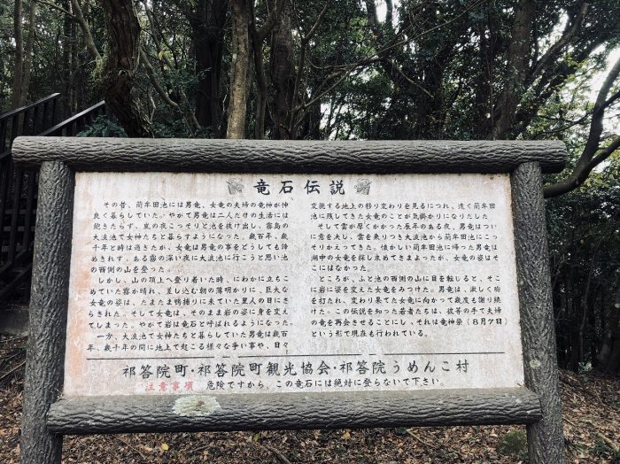 降り道は来た道を含め3つあります。湖側の道から下山すると、出口に竜石伝説の掲示板があります。