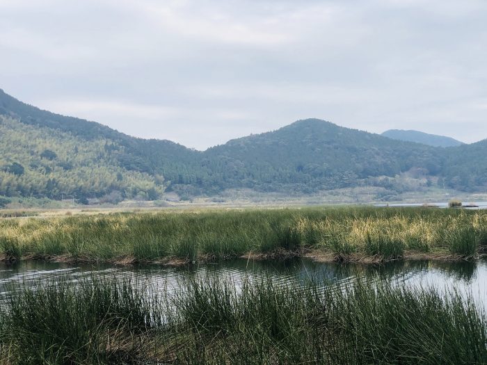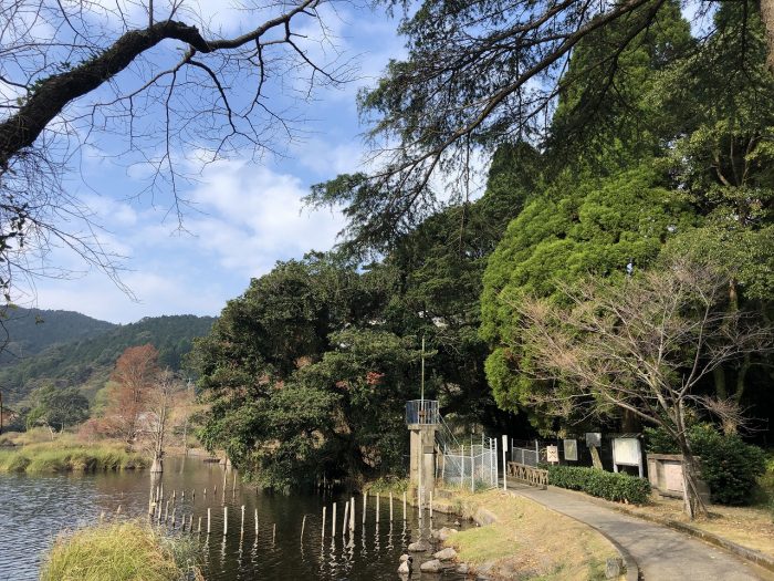 冬の藺牟田池。「特に水鳥の生息地として国際的に重要な湿地に関する条約(ラムサール条約)」登録湿地であり、ベッコウトンボの生息地保護区となっています。
