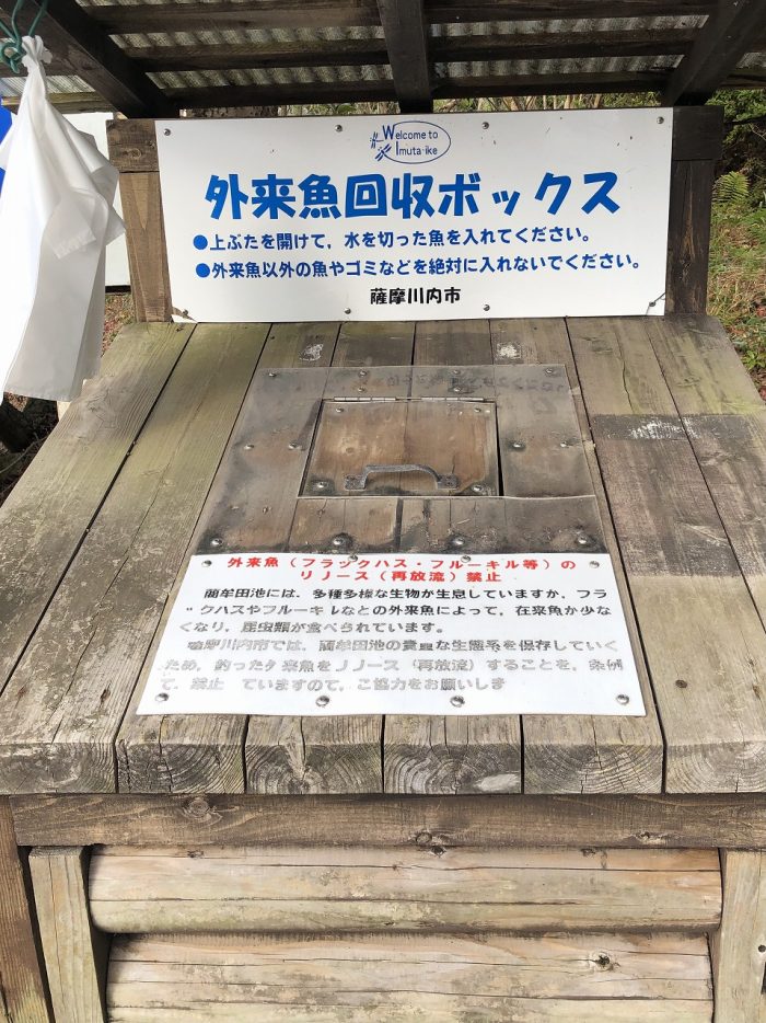 園内にある外来魚回収ボックス。藺牟田池の貴重な生態系を守るために、ご協力よろしくお願いします。