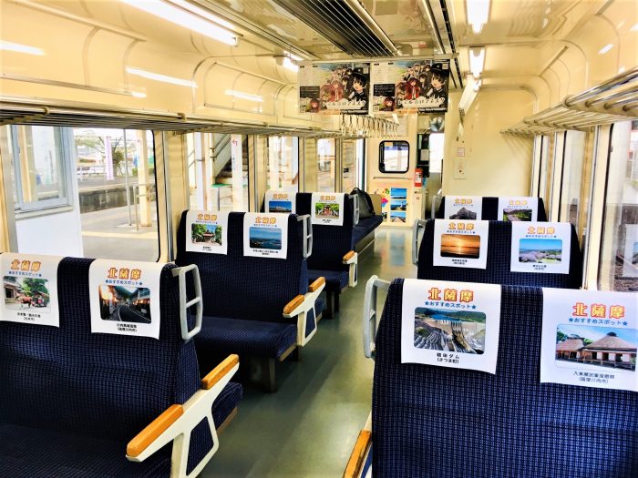 薩摩川内市をはじめとする北薩地域の沿線自治体の観光地が車外と車内にラッピングされ、車内の座席マクラカバーには各市町のおすすめスポットを掲載し、PR感満載です。