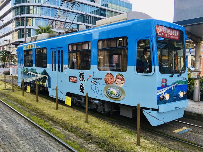 鹿児島市電では9502号に、昨年8月に開通した甑大橋を中心にラッピングされています。