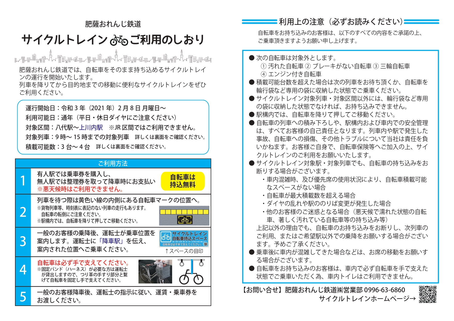 自転車の持ち込みをされる際は、「サイクルトレイン利用のしおり」、「サイクルトレイン時刻表」をご覧いただき、内容にご了承をいただいた上で、ご利用いただきますようお願いいたします。