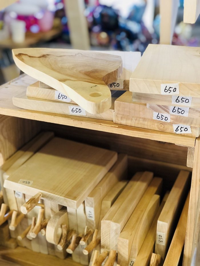 いちょうの木を使ったカッティングボード。持ち手が枝で雰囲気いいですね。
