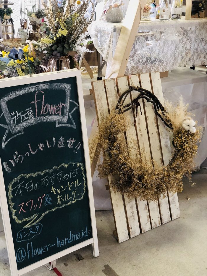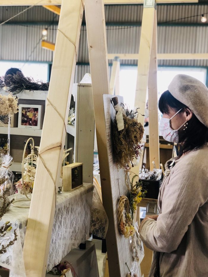 薩摩川内市の川永野から出店。生花、ドライ、プリザーブドとさまざまに組み合わせたブーケやスワッグを楽しめます。