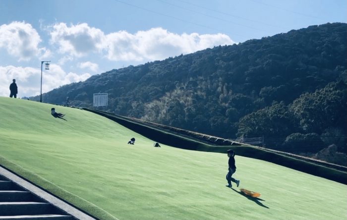 SOKO KAKAKAから河川敷にあがると、川内川と空の青、芝生と山々の緑に包まれます。子どもたちがそりで滑ったり、全身で転がったりして、思う存分遊んでいます。