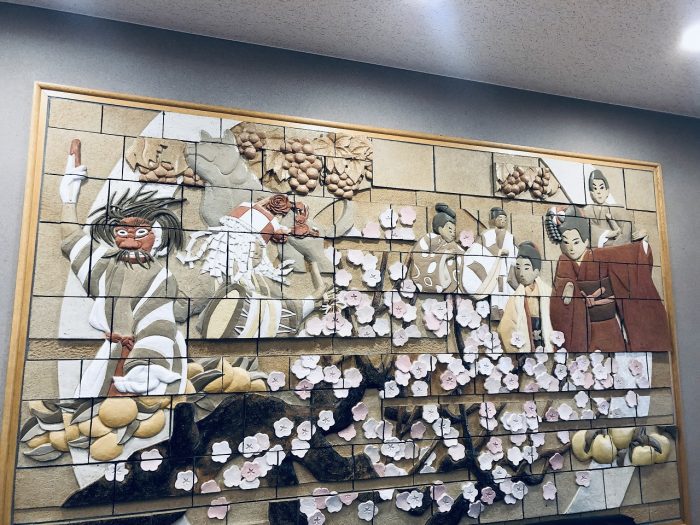 臥竜梅、学問の神様菅原道真を祀る藤川天神、東郷文弥節人形浄瑠璃など、東郷のみやびな文化を伝えるレリーフ。