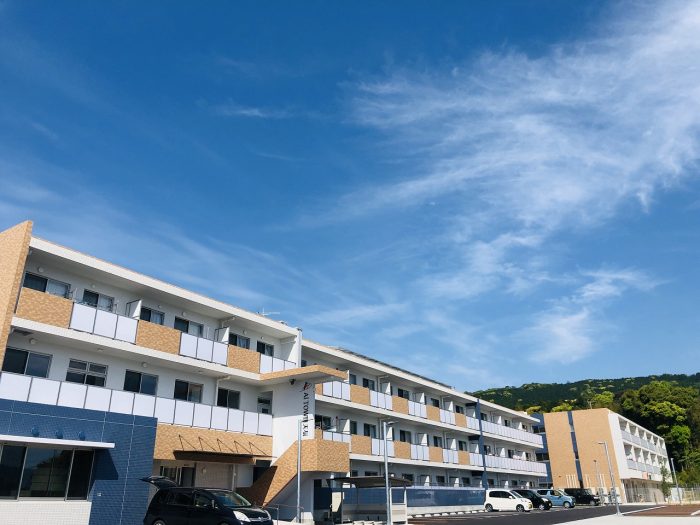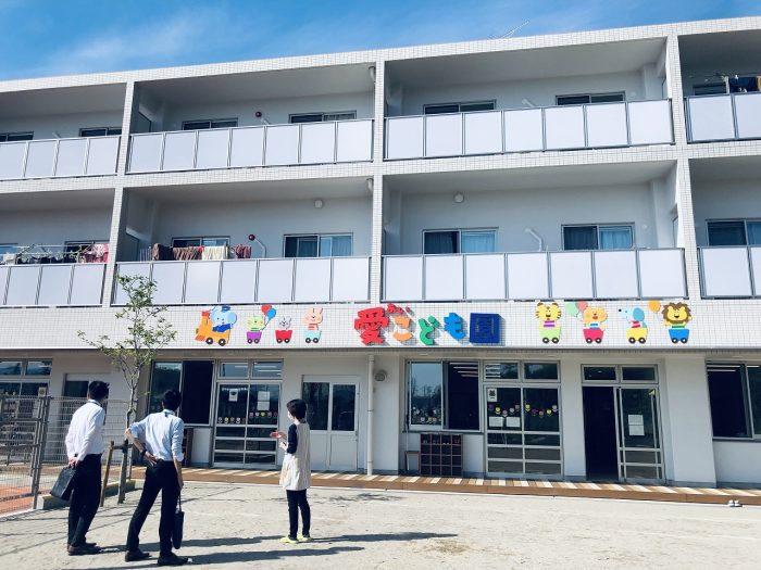 2021年3月完成の集合住宅。AI TOWN天辰のシンボル的建物には集会所やカフェ、認定こども園を備えます。