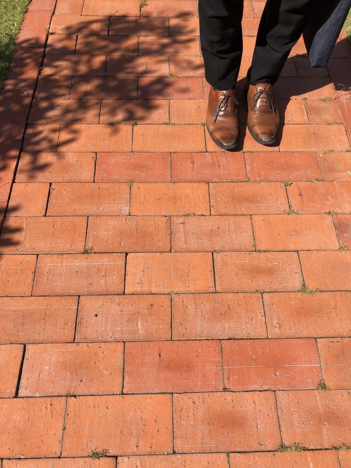 足もとを彩る明るい舗道は、ソフトな感触のエコレンガ。