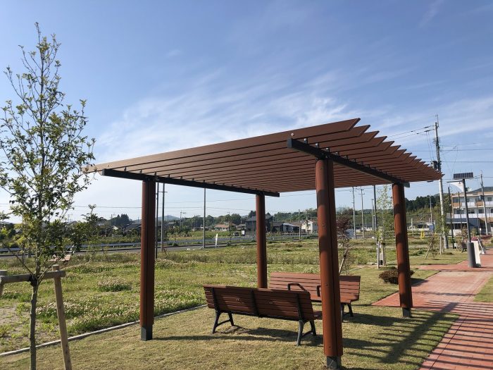コミュニティ広場に設置されているパーゴラ(日陰棚)。住民の憩いの場としてだけではなく…