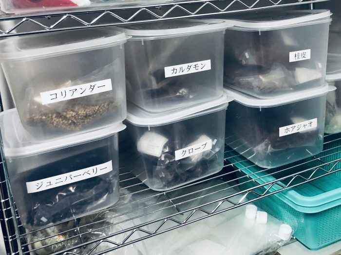 「ホアジャオという四川料理の麻婆豆腐に使われる花山椒やカルダモン、桂皮(東洋シナモン)、クローブ、ジュニパーベリー、ジンジャーなど厳選して使っています」クラフトコーラの命ともいうべきスパイスの配合は企業秘密ですが、使用している材料は公開OKと!すべて見せて頂きました。