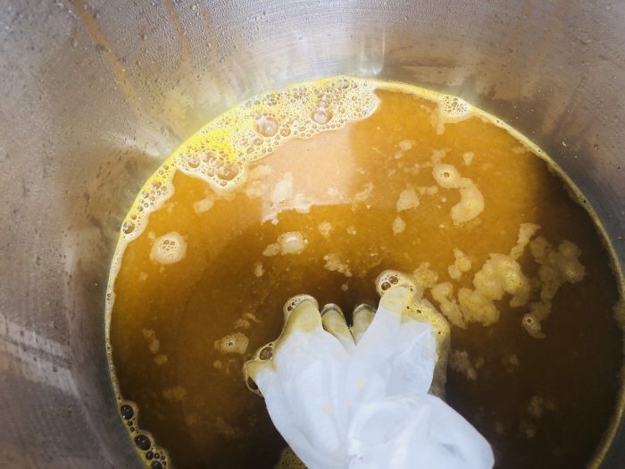 じっくりと煮出したスパイスにフレッシュな果汁を合わせます。「水分を飛ばして味を凝縮させながら、それぞれのスパイスの香りを最大限に引き出すためには、温度管理がとても重要ですね」と、真剣な表情。煮出しと寝かせに数日かけて作業は続きます。