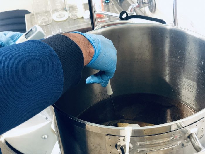 下園社長みずから温度計を手に、作業を進めていきます。天然の甘みをもつ甘茶を使うことで、砂糖の使用量を減らしながら、きび砂糖で優しい甘みをプラス。また、甘みを引き立たせミネラルを供給する大事な塩は、薩摩川内市甑島産の塩を使用。商品としての保存期間も考慮しながら、理想のクラフトコーラを目指し、スパイスを加える行程など、今もいろいろと試行を重ねているんだそう。