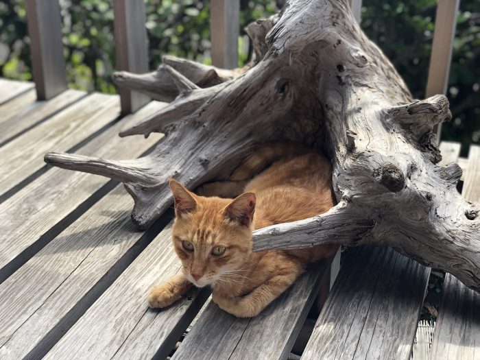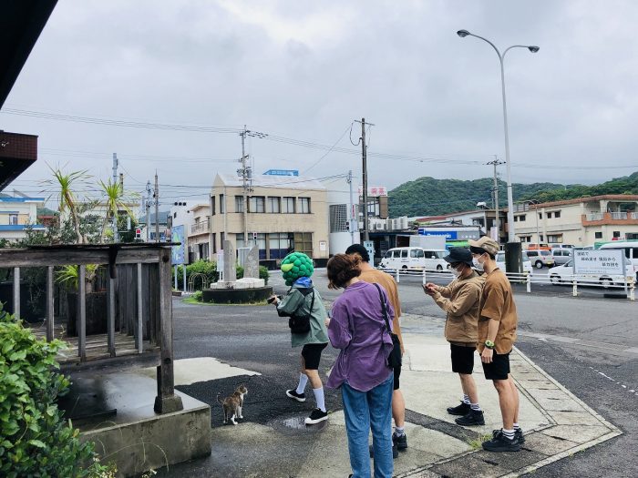 寿し膳かのこで満腹になったご一行。撮影隊を置いてやってきたのは中甑港にあるコシキテラス。手持ちカメラで猫とたわむれるC&K。