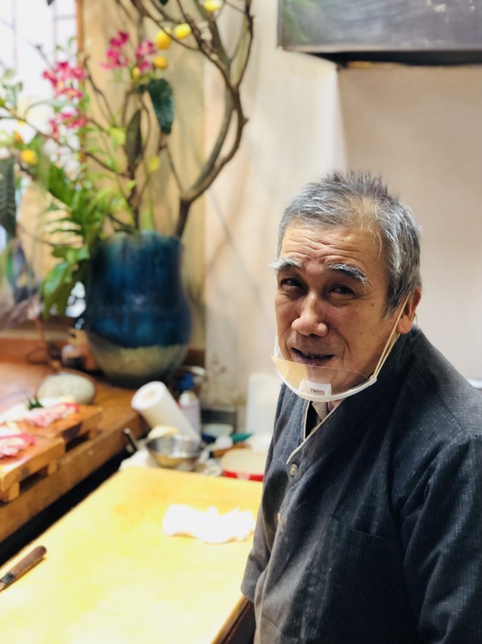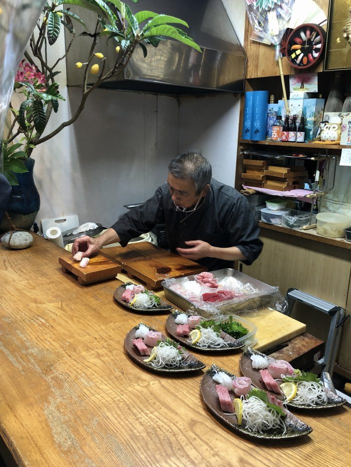 カウンターでひとり、黙々と寿しを握る大将。手前のお刺身、どれだけ厚切りか、ご覧いただけますか?!