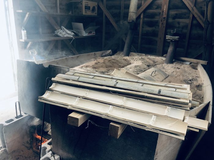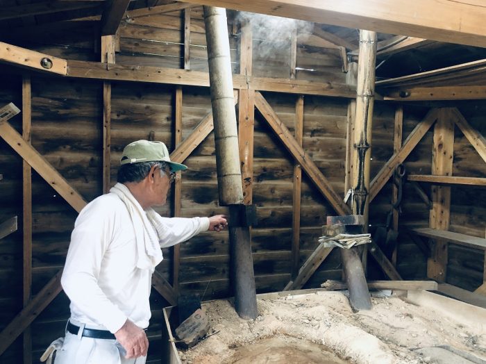 炭焼き窯はすべて堂込さんの手づくり。窯に温度計はなく、立ちのぼってくる煙の色や香りで窯の様子を判断します。条件が揃うと、火入れから数時間後に、竹が自分で熱を持ち燃える、自燃(じねん)という状態になります。自燃の状態になってから17~18時間を保つと、竹が炭になるのだそうです。