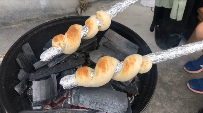 竹にアルミホイルを巻き、パン生地をくるくると巻きつけて…
