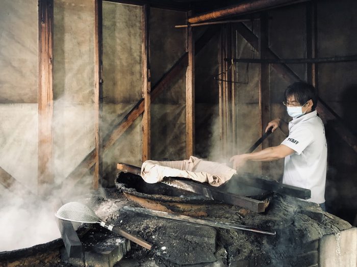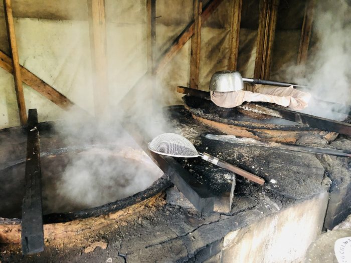 こしきの海から汲み上げた海水を、ただひたすらに、鉄鍋で煮詰めては、こす作業を繰り返していきます。2、3日かけて焚き続け、日に干し、1週間程度で完成します。500リットルの海水から、およそ15kgの塩ができるのだそう。