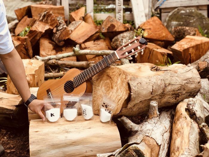 こしきの手づくり塩、左から「K」「いいあんばい」「乾き亭げそ太郎」「こかじお」のラインナップ。互いに味見し合っては「誰の塩がいちばん優しいか」「塩の味に性格が出るのか」等々、議論していました。