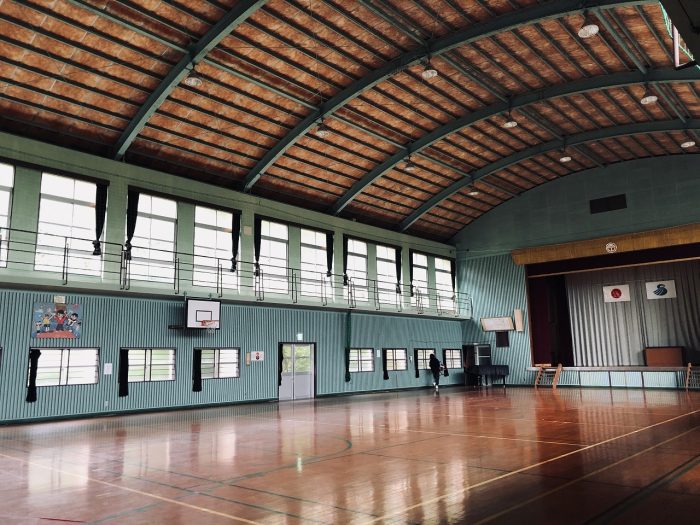 一夜を明かした西山小学校の体育館。設営したテントもきれいに撤収。まさに来た時よりも美しく。「お世話になりました」と体育館に一礼する4人の姿がありました。