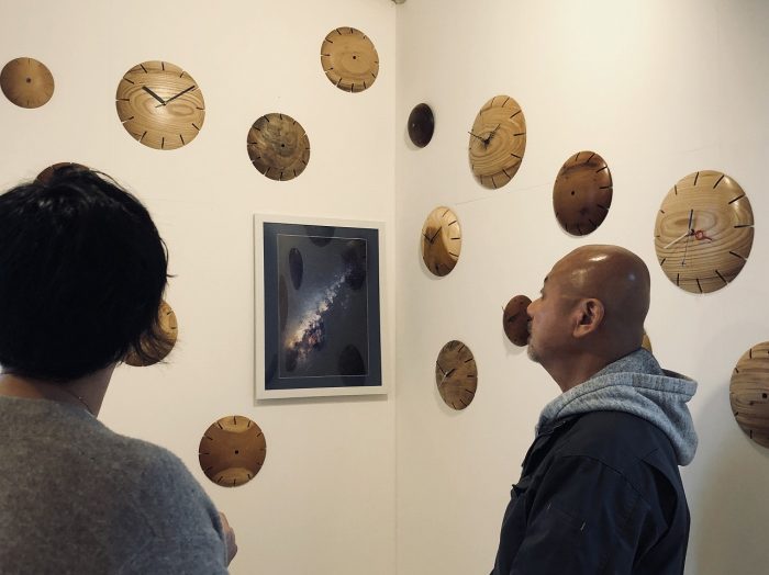 シグニチャー作品のひとつ「惑星」シリーズ。木目の織りなす模様が「惑星みたいだね」とお客さまから言われたのが由来とのこと。初期の作品は装飾的なものでしたが、次第にシンプルな今のかたちへ。針を選び、オリジナルの時計を作ることもできます。