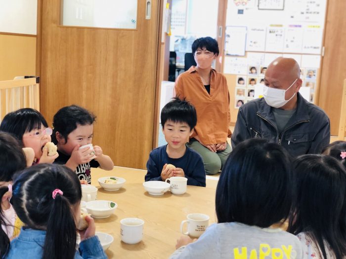テーブルの脚を修理して再び納品したある日。3時のおやつを見届けながら。