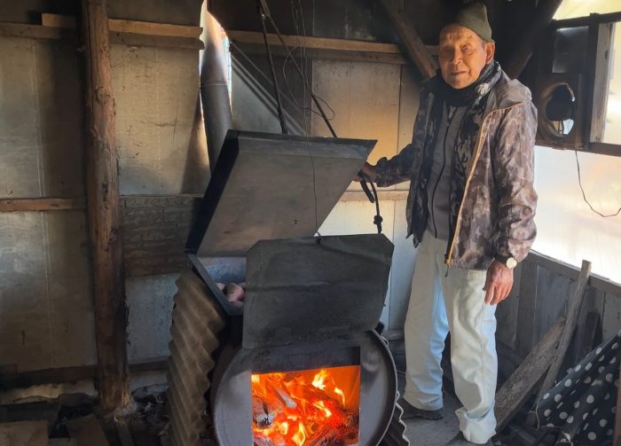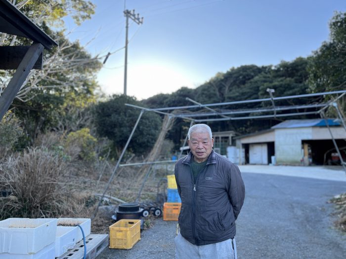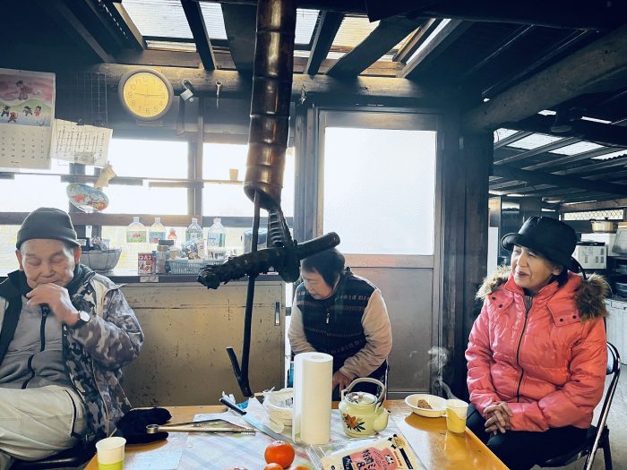 山頂からふもとに降りると、峰山地区コミュニティの皆さんが山小屋に集まっていました。小学校にウサギのえさを届けてきた男性。柳山アグリランドで飼っているヤギのえさやりなど担当しています。