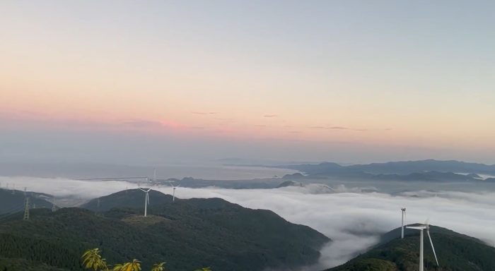 高江から柳山へと向かう道、風車が朝陽を受けてゆっくりと回っているのが見えます。川内駅から柳山(アグリランド)へは車で約30分。民家を抜け、山道を走ると「柳山アグリランド」に到着します。
