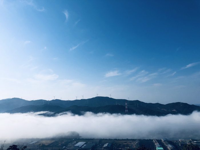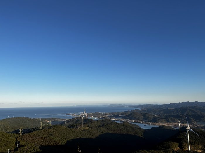 月屋山側から見た柳山。風車が見えますね。川内川あらしを間近に見るなら月屋山、川内川あらしと町を見渡すなら柳山、といったところでしょうか。(月屋山からの川内川あらし記事はこちら)
