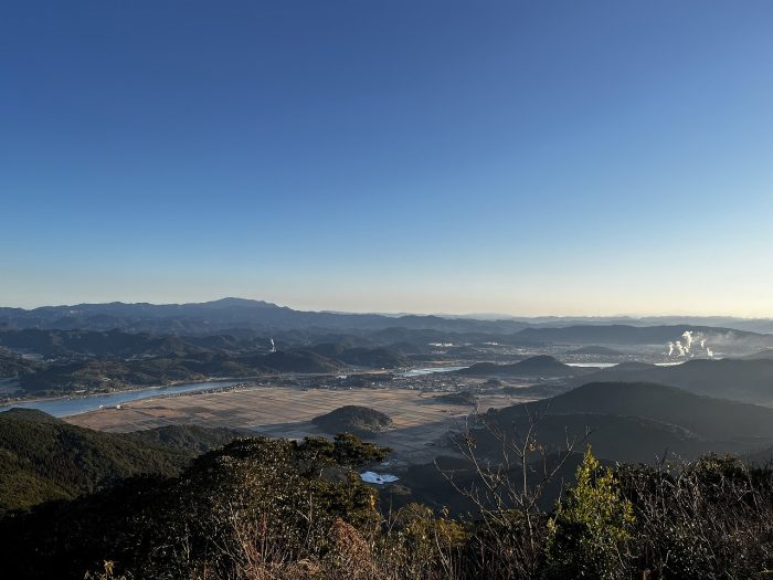 柳山山頂からの眺め。東シナ海へと流れ込む川内川河口が見えます。川内川あらし観察スポットの月屋山の対岸になります。