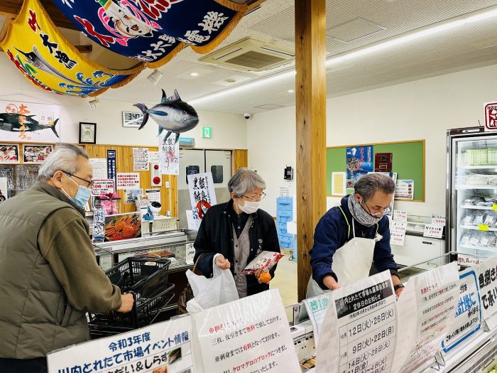 魚を並べるスタッフさんと会話しながら、お買い物を楽しむご夫妻。薩摩川内市内にお住まいで「とれたて市場の魚はとにかく新鮮、安い。魚を食べたい時は、いつもここで買っていますよ」と笑顔でした。