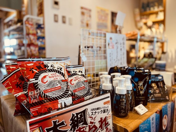 薩摩川内市の伝統行事「川内大綱引」にちなんだスナック菓子や、甑島の海洋深層水を使用した化粧品など。3月には一部商品を対象にクリアランスセールを実施予定とのことです。