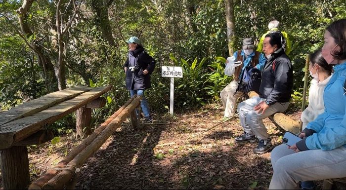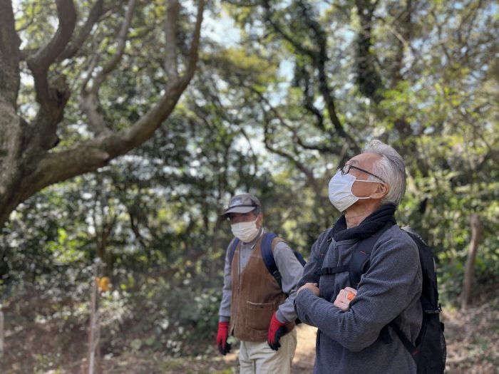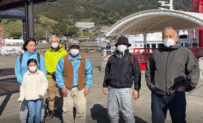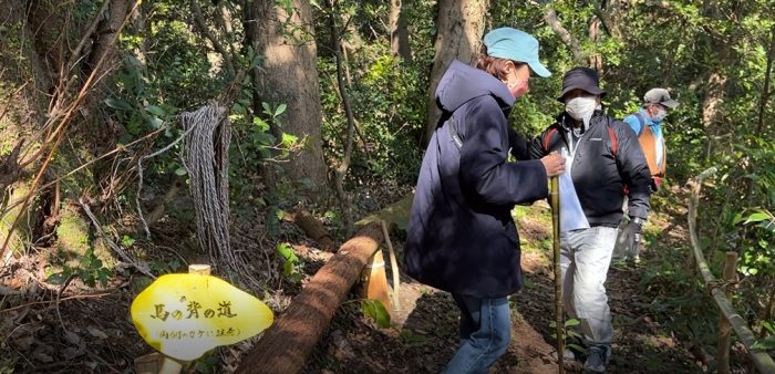 乗船すること95分、下甑・長浜港に到着しました。長浜地区コミュニティ協議会の皆さんと合流し、樫の木児道へと向かいます。このトレッキングコースは過去に2回「樫の木児道を歩いてみる会」としてイベント開催されています。各回100名以上の参加者が集まる盛況ぶりで、今季も開催が予定されていましたが、社会状況を鑑み延期に。2022年度中の開催を検討しているとのことですので、お楽しみに。