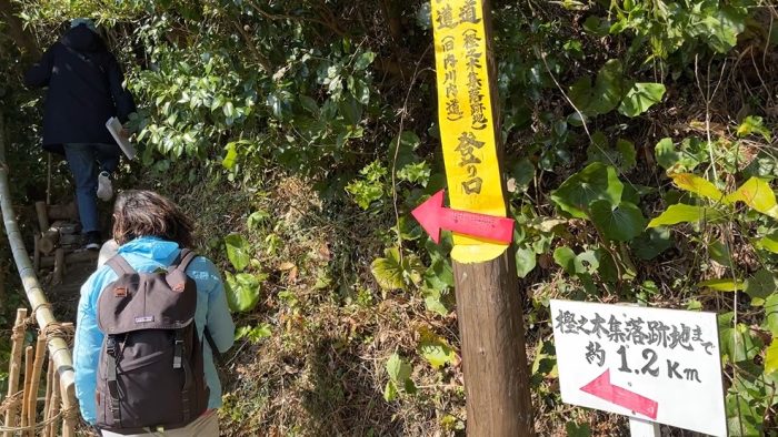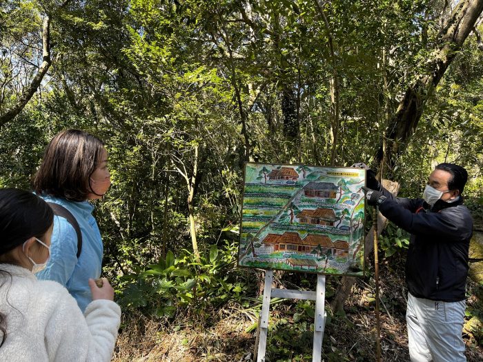 きれいな景色に元気をもらい、さらに歩いていきます。ゆっくり登って30分~40分くらいでしょうか、樫の木集落跡地に到着しました。写真上は昭和30年代当時の様子をいきいきと描いた看板です。段々畑で茶や芋を栽培していた暮らしの跡を、今も確かめることができます。