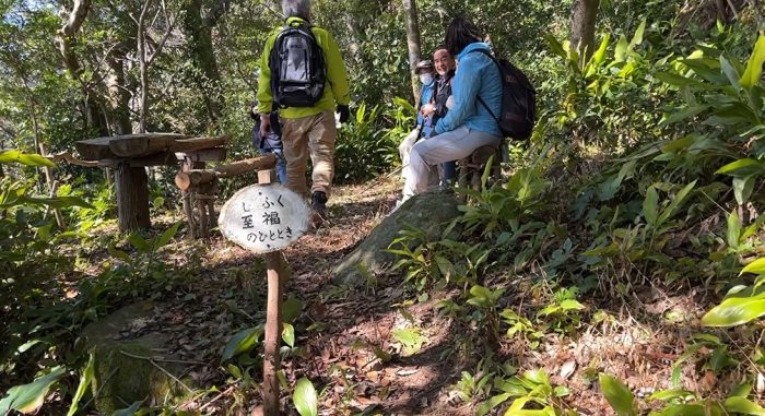 集落跡の暮らしの名残やシンボルツリーを眺めながら、てくてくと登っていくと「一福、二福、三福」と看板が適度に休憩するタイミングを教えてくれます。そしてたどり着いたのが「至福のひととき」!