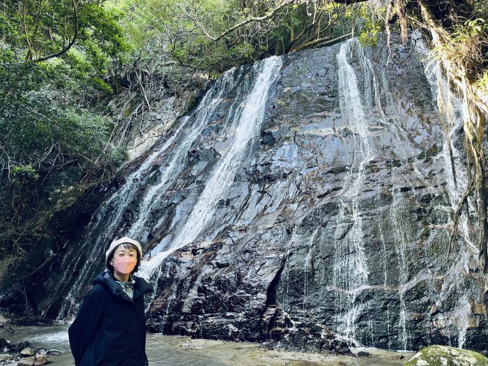 こちらは下甑を代表する観光スポットのひとつ瀬尾(せび)観音三滝。長浜港からは車もしくはバスのご利用が一般的です。付近にはキャンプ場を備え、夏でも緑深く、涼しげな場所です。名の通り三つの滝があります。写真上が三番目の滝です。大きな台形の岩を清流がレースのカーテンのように流れ落ちる様は必見です。時間に余裕があれば、ぜひ階段を上がり二番目の滝までご覧ください。