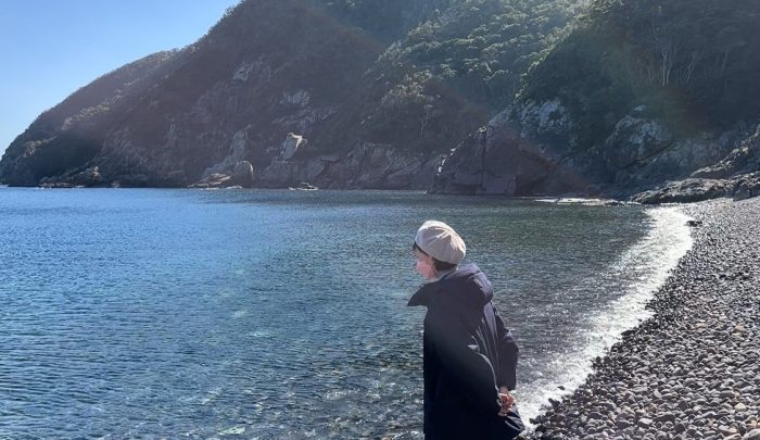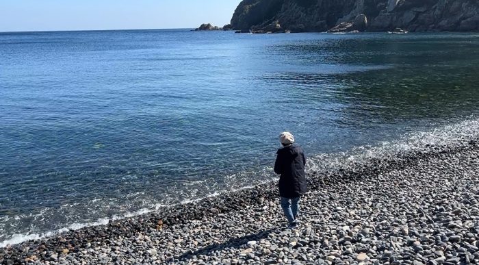 瀬尾観音三滝からさらに南へ。こちら、知る人ぞ知る佐之浦ビーチです。砂浜ではなく、小さな玉石の海岸です。打ち寄せる波に、石がコロコロと音を立てます。