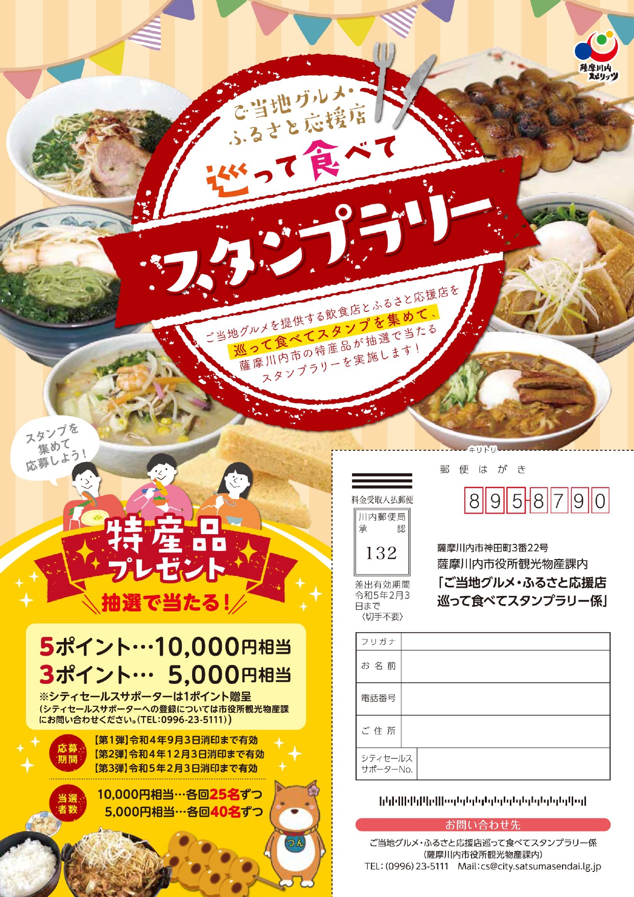新型コロナウイルス感染症拡大により影響を受けた飲食店への応援と観光誘客を目的に、ご当地グルメを提供する飲食店とふるさと応援店としてシティセールス活動を実施する飲食店を巡って、食べて、スタンプを集めて、薩摩川内市の特産品が抽選で当たる事業を実施。3ポイント以上の方に抽選で薩摩川内特産品をプレゼントします。