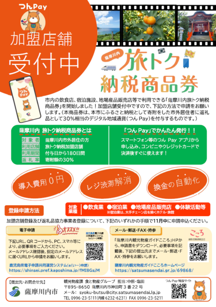 「つんPay」及び「薩摩川内旅トク納税」加盟店舗募集!