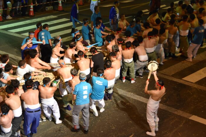 約3,000人の上半身裸にサラシを巻いた「ハダカ」と呼ばれる男たちが、互いに大綱を引き合います。