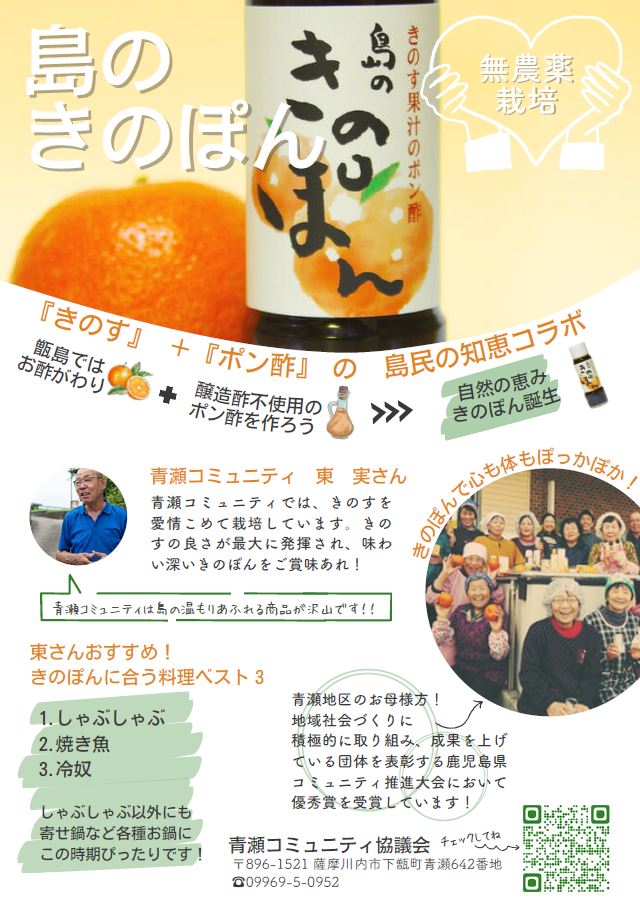 甑島の青瀬地区コミュニティ協議会がその「きのす」を使用して作ったポン酢が「島のきのぽん」です。