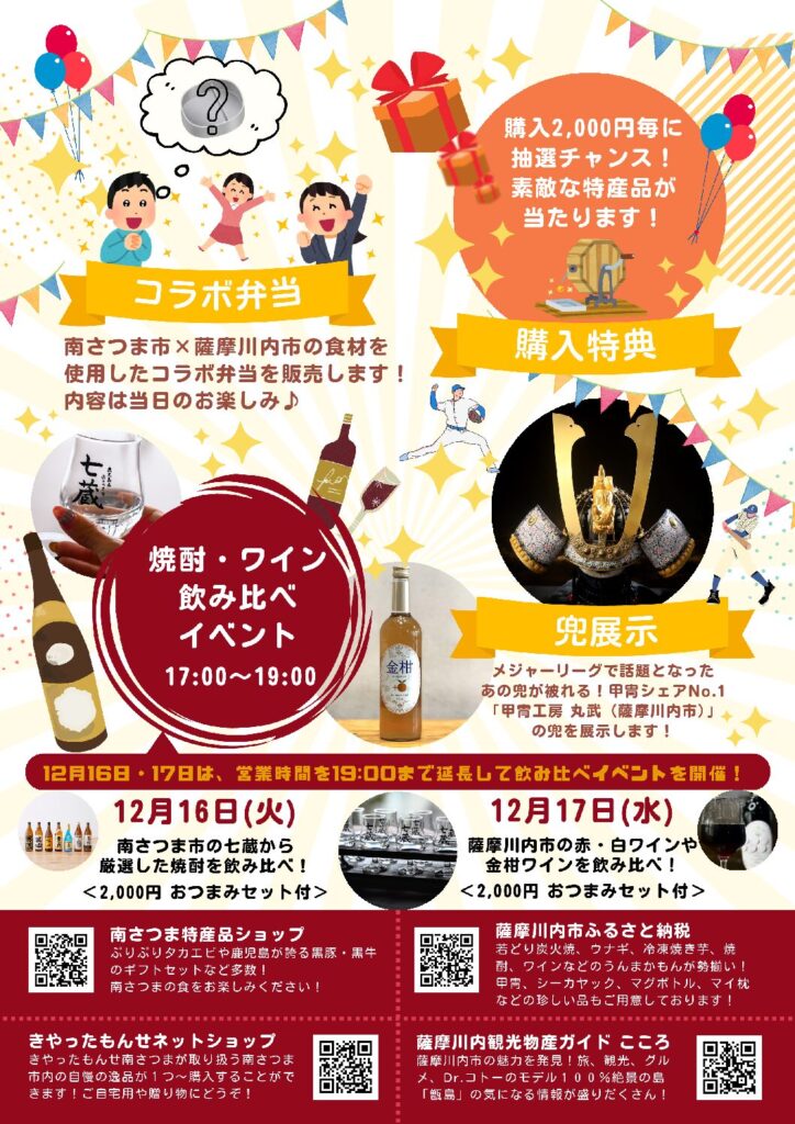 イベントでは、きくらげ詰め放題や特産品が当たる抽選会のほか、16日は南さつま市の焼酎、17日は薩摩川内市のワインの飲み比べイベントも開催。それぞれの市の特色あるおつまみと共にお楽しみください♪