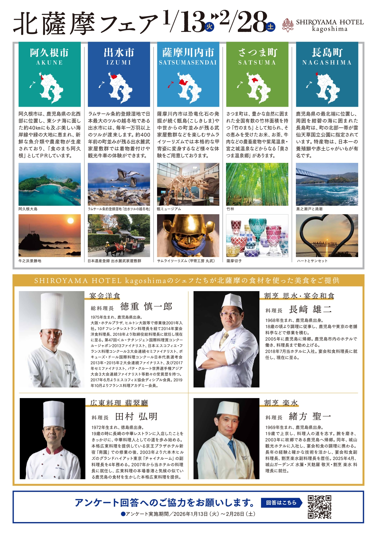 期間中は、北薩摩地域である阿久根市・出水市・薩摩川内市・さつま町・長島町が誇る食材を使ったレストランフェア、特産品販売を行います。ぜひお越しください。